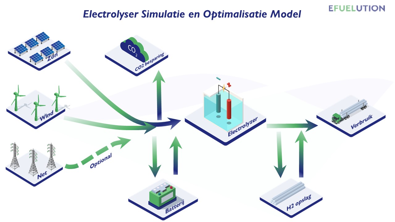 Als u, net als veel van onze klanten, van plan bent waterstof te produceren met uw eigen elektrolyzer, kunt u tegen een aantal cruciale vragen aanlopen. Hoe bepaalt u de juiste grootte van de elektrolyzer? Hoeveel waterstof zult u in de toekomst produceren en hoeveel elektriciteit zal daarvoor nodig zijn? En hoe gaat u om met situaties waarin er geen wind is en de zon niet schijnt? Bij eFuelution bieden we oplossingen voor deze vragen met ons zelfontwikkelde dynamische simulatiemodel. We leggen u graag kort uit hoe het werkt.